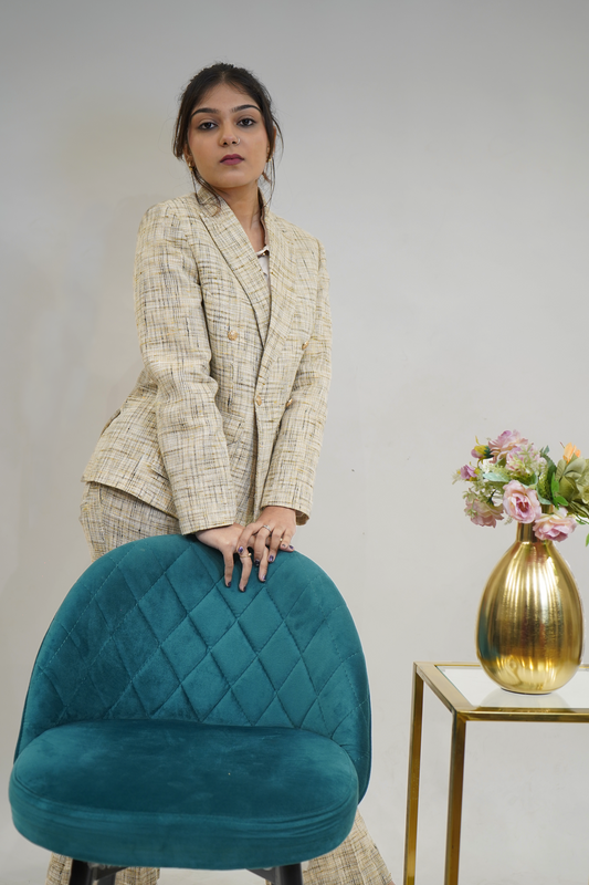 Cream self textured linen based 2 piece double breasted blazer trouser set.