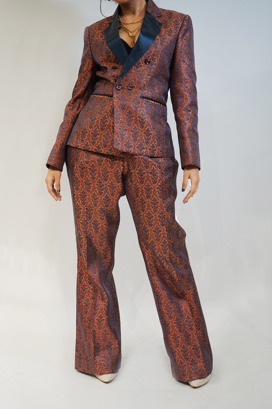Rustic brown Jacquard 2 piece double breasted with contrast lapel blazer trouser set.