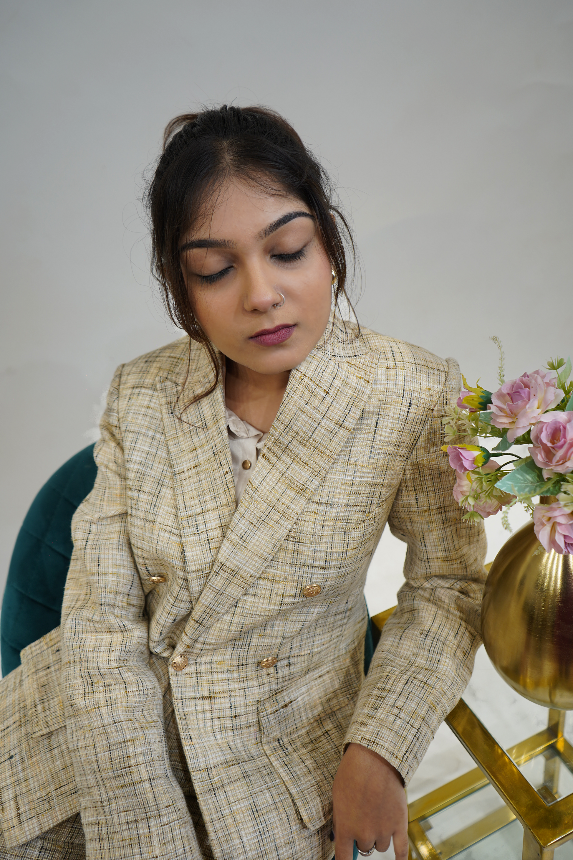 Cream self textured linen based 2 piece double breasted blazer trouser set.